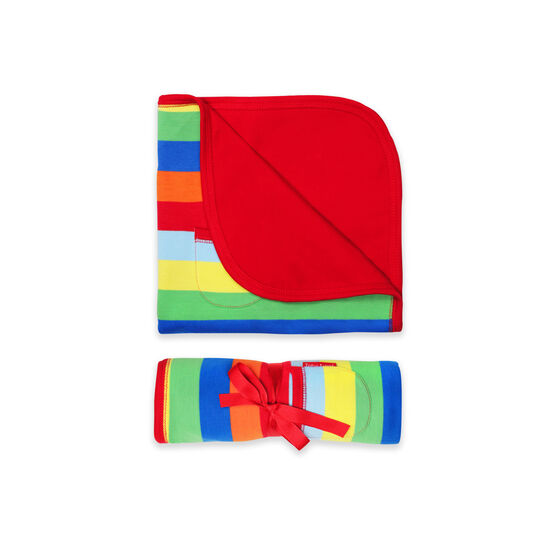 Rolled and wrapped with a ribbon, the blanket also makes for a wonderful new-baby gift. Made from Global Organic Textile Standard (GOTS) certified soft cotton, with bright colours achieved using machine washable, azo-free dyes, it also features a small pocket on the front and plain red backing.
