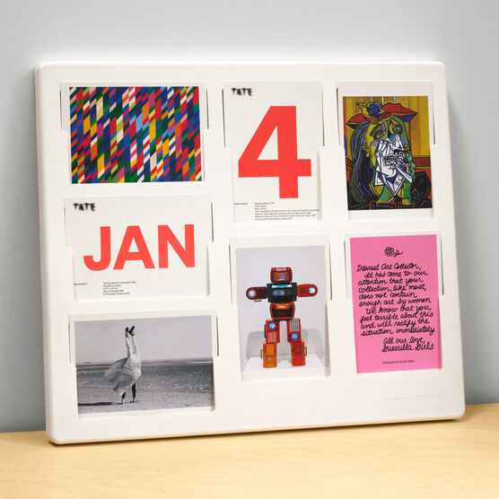 Seven postcard slots are indented in the calendar frame, allowing you to choose your own arrangement of the artwork, month and date postcards. 24 postcards are included with the calendar, each featuring a different Tate collection artwork, with a date or month printed on the back. As the postcard slots are made to fit standard postcards, you can add favourites from your own collection, or add new ones from your favourite exhibitions, allowing the calendar display to evolve with you over the years.
