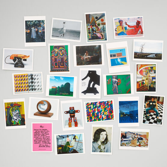 The postcards in the set feature artworks by Pacita Abad, Pauline Boty, Frank Bowling, Sonia Boyce, Patrick Caulfield, Salvador Dalí, Rose Finn-Kelcey, Lucian Freud, Guerrilla Girls, Lubaina Himid, Barbara Hepworth, David Hockney, David Inshaw, Wassily Kandinsky, Sarah Lucas, Winifred Nicholson, Nam June Paik, Pablo Picasso, Bridget Riley, John Singer Sargent, David Shrigley, Jeff Wall, Andy Warhol and John William Waterhouse.